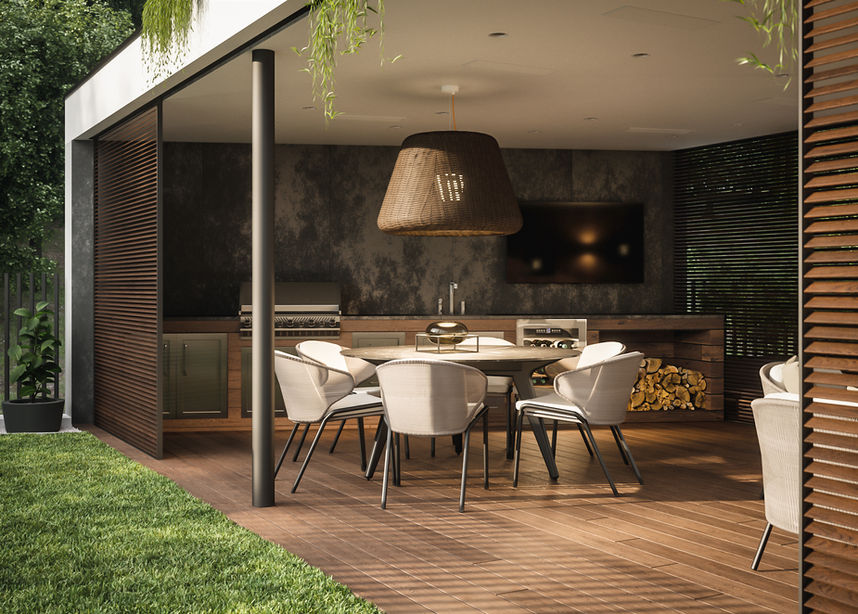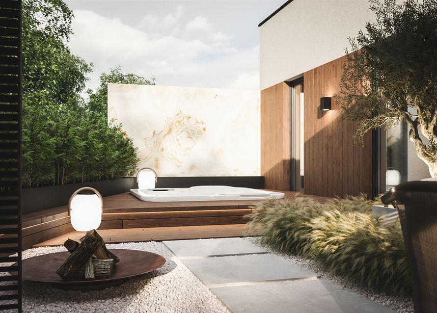 Prianím nášho klienta bola do zeme zapustená vírivka, japonský bonsaj v predzáhradke, zelená strecha a zapúšťacia brána. Na zatienenie terasy sme použili slnolamy posúvateľné po celej dĺžke terasy. V zimných mesiacoch zahrejú do stropu zabudované ohrievače.