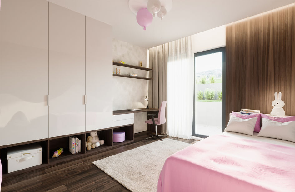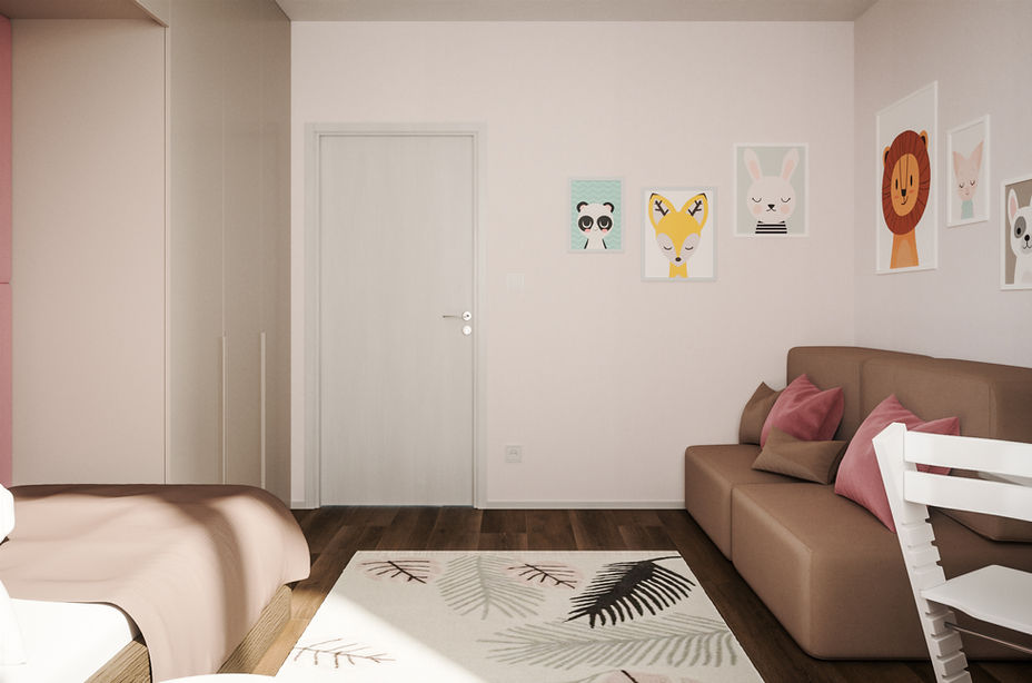 Návrhy detských izieb pre dievčatká so zakomponovaným rastúcim nábytkom a už existujúcimi produktmi ako sedačka, koberce, kresielka a obrazy na stenách.